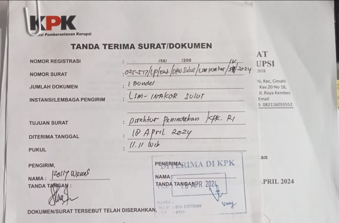 Berdasarkan dokumen yang didapat media surat KPK yang dikirim pada 17 Mey 2024 dua pekan lalu bernomor R/2193/PM.00.01/30-35/05/2024 dengan sifat SEGERA, HAL, Tanggapan atas laporan masyarakat, surat tersebut di teken oleh Deputi Bidang Informasi dan Data KPK, Eko Marjono. Dalam suratnya ada tertulis, sebagaimana dengan laporan saudara kepada Komisi Pemberantasan Korupsi (KPK) tertanggal 16 April 2024 kami menyampaikan apresiasi atas peran serta saudara dalam pemberantasan tindak pidana korupsi.