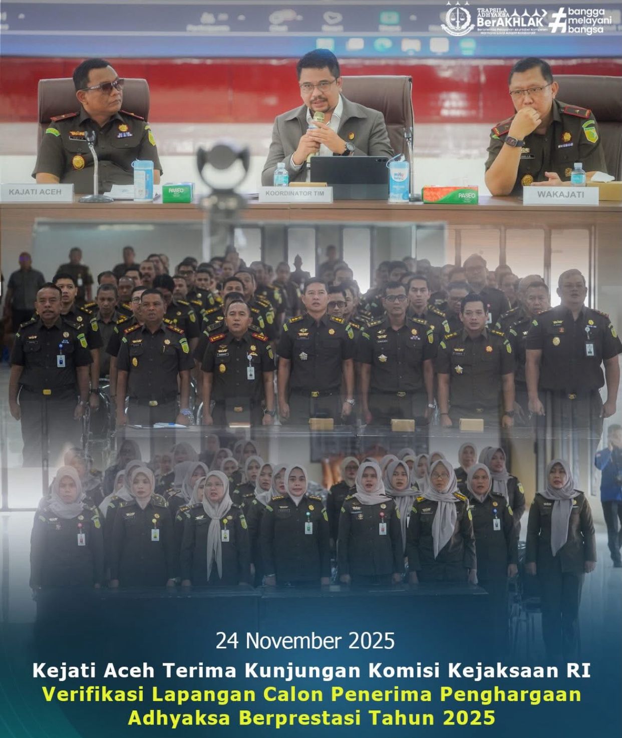 Banda Aceh, IBInews.co.id — Kejaksaan Tinggi Aceh menerima kunjungan kerja dan verifikasi lapangan dari Komisi Kejaksaan Republik Indonesia. Kunjungan ini merupakan bagian penting dari proses Penganugerahan Komisi Kejaksaan RI Tahun 2025 yang bertujuan untuk memverifikasi langsung unit kerja dan individu yang diusulkan berprestasi di lingkungan Kejaksaan Tinggi Aceh.