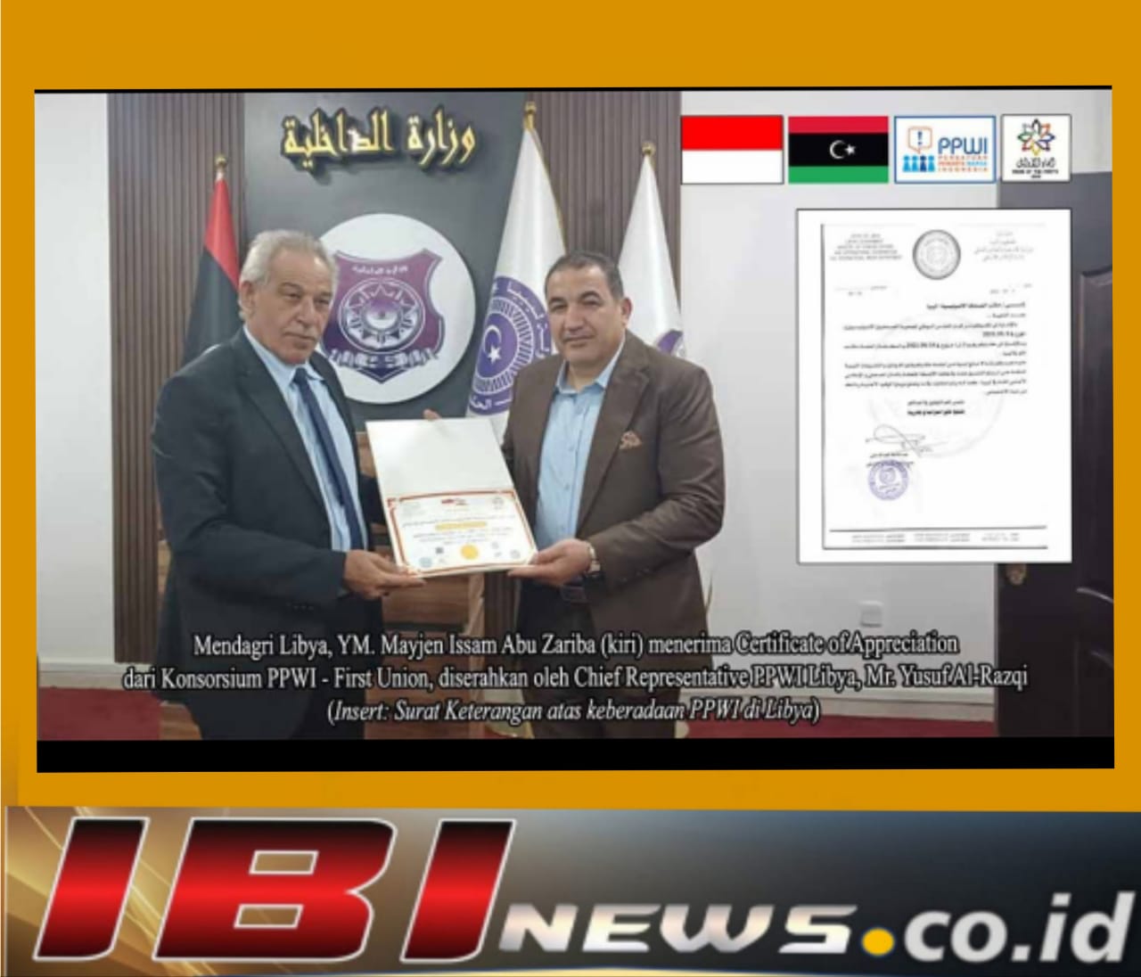 Menteri Dalam Negeri Libya, YM Mayjen Issam Abu Zariba, menyatakan sangat mengapresiasi dan bangga menerima Piagam Penghargaan dari konsorsium PPWI – First Union. Bahkan Kementerian ini juga sudah menerbitkan surat resmi, semacam Surat Keterangan Terdaftar, atas keberadaan PPWI di Libya beberapa waktu lalu.