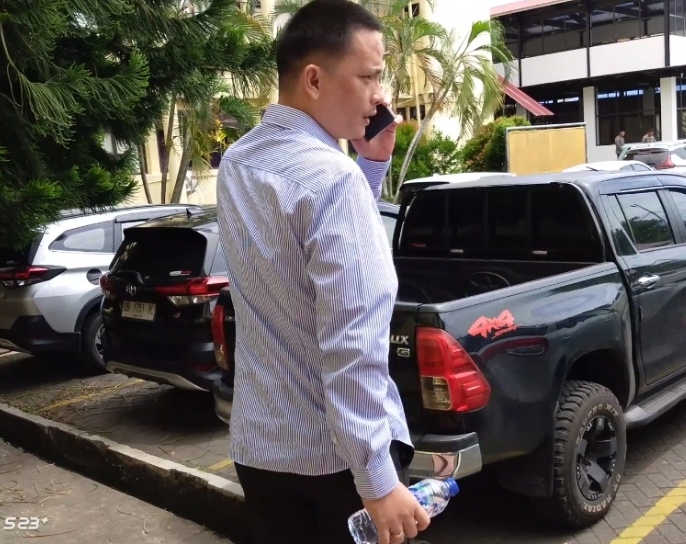 Memakai kemeja lengan panjang berwarna putih dan celana panjang berwarna hitam kemudian langsung menuju masuk ke ruangan penyidik no 8 untuk dilakukan pemeriksaan.