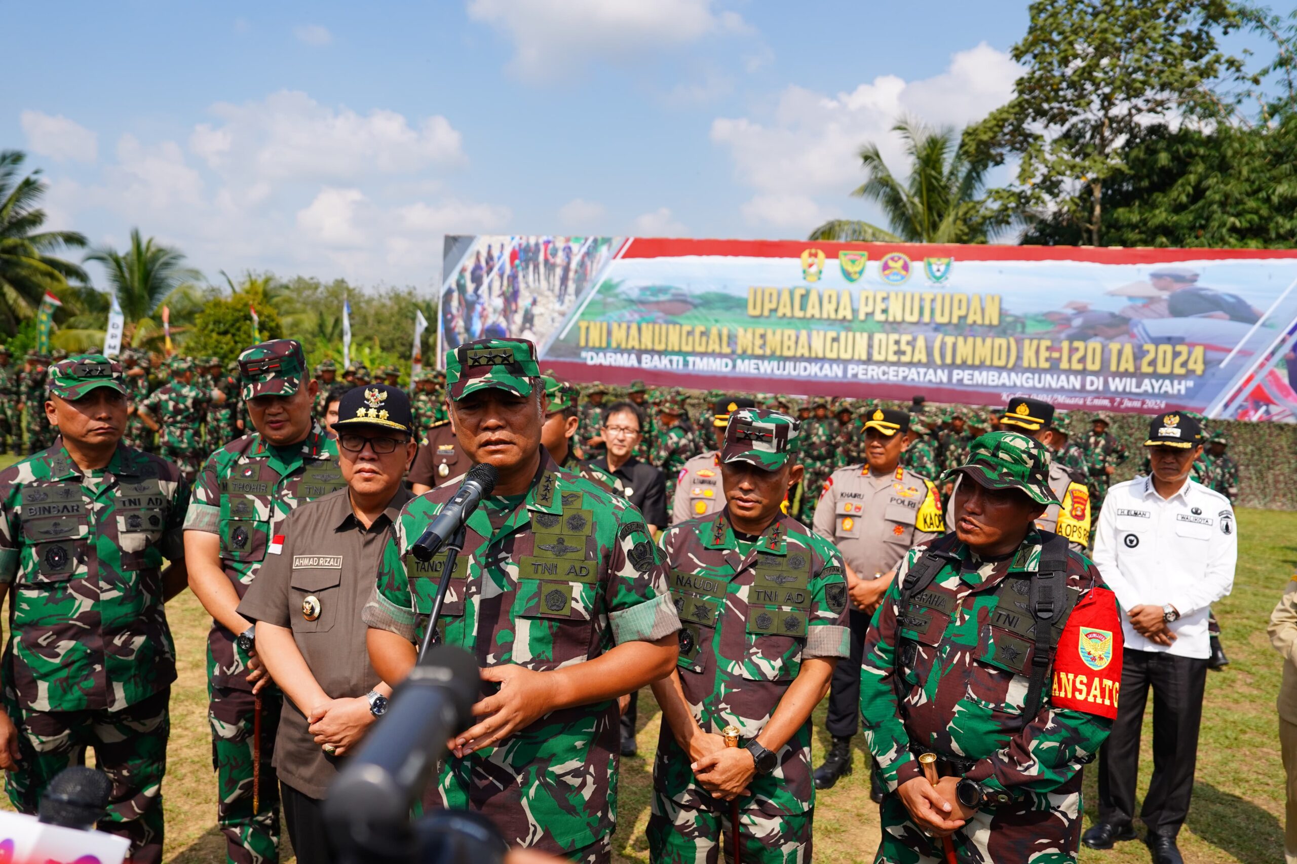 Wakil Kepala Staf Angkatan Darat (Wakasad) Letjen TNI Tandyo Budi Revita didampingi Pangdam II /Sriwijaya Mayjen TNI Naudi Nurdika menutup secara resmi TMMD Ke-120 Kodim 0404/ME yang dipusatkan di Lapangan Desa Sidomulyo Kec. Gunung Megang Kab. Muara Enim, Jumat (07/06/2024).